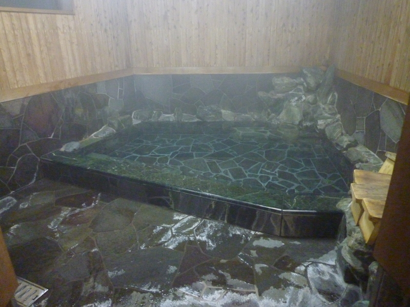 浴場は家庭の浴室を一回り大きくした広さのかけ流しの岩風呂。原則として順番待ちの貸切である。
